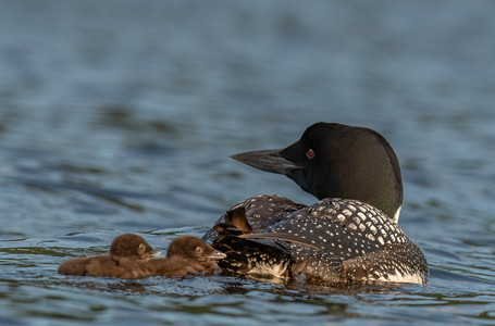 What an awesome adventure on a local reservoir to see a Common Loon family with two very young chicks! Myself and four other birding adventurers kayaked on a late afternoon at 4:30 pm to see a Loon family that had been discovered earlier. We kayaked a fair amount (about 3-4 miles total) before spotting the family relaxing in a sheltered cove. Always respectful of distance and the birds, paddling ceased, and we let our kayaks drift. My favorite moment was seeing one chick just sleeping on its parent's back. Common Loons nesting on lakes is quite common in VT, NH, and ME, but quite rare in MA. Efforts have been made to reintroduce them to MA by relocating them here (Assawompsett Pond complex) and providing artificial nesting sites (Wachusett and Quabbin Reservoirs), but they are still quite rare to find in MA. Interestingly, they are very common on MA coasts where they winter in larger numbers. Common Loons exhibit nest fidelity so they will hopefully nest again in this location. I, myself, never look for the nest as they are so vulnerable and do not appreciate human interference as they can't swim away. Their nests are always very close to the water as walking is not their forte! If you approach these loons on the water, and they lift their body out of the water and flap their wings, they are telling you to back off. It is a territorial display. Of note, lead poisoning is an issue for these birds as they pick up lead sinkers and lead shot to help digest their food.