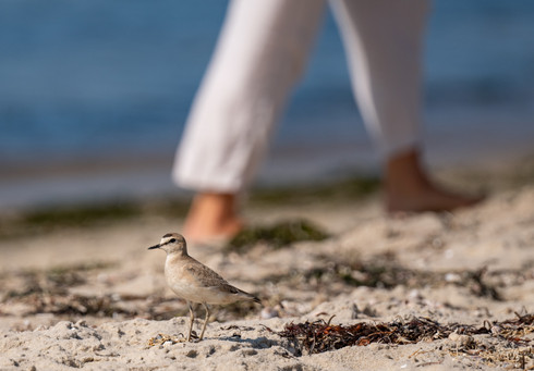 This particular bird was foraging along the wrack line at Long Beach, and it seemed completely unperturbed by all of the commotion that it was causing. Photographers were lined up in a semicircle, and beachgoers were pausing to ask questions and admire the bird. Mountain Plovers are quite beautiful in their breeding plumage with a golden color overall, a dark spot on their forehead, and a black eye stripe. The size was more like a Black-bellied Plover than a Piping Plover, the latter of which were also nesting nearby. This lone Mountain Plover hung around for another few days and then wasn't spotted anymore.