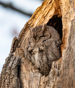 I met Carol M. north of Boston today to visit the Red-headed Woodpecker and decided to stop near the Parker River National Wildlife Refuge at sunrise to look for Screech Owls. It is much easier to spot them with the leaves gone and sunrise and sunset are the optimum time to see them at the edge of their holes. We were lucky to spot both a red morph and then a gray morph about 100 yards away in a separate hole. Hopefully they are a mated pair and we can look forward to owlets! Oh, and the Woodpecker is still excavating and hording acorns in the same location!