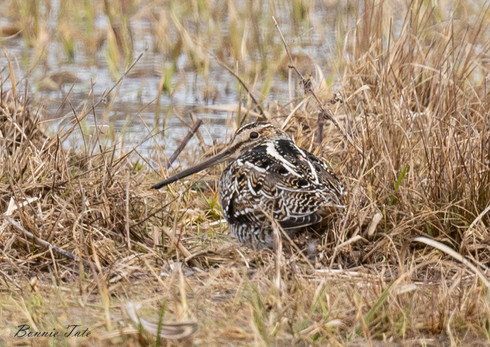 I headed out to Shaw Road in Fairhaven to see if I could spot the White-fronted Geese that had been posted on the MA ebird rare bird alert. I saw only Canada Geese, a solitary Killdeer, and Mallards. I then remembered that Wilson's Snipe were also reported in the puddle that was roadside on the way to the farm. Never having seen a Snipe before, I carefully scanned the grass around the puddle using binoculars and kept coming back to this lighter-colored spot that seemed a little "different". I trained my Zoom lens on the area and saw a very small bird with a long bill and beautiful brown and white stripes. Merlin confirmed it was a Wilson's Snipe, and it was another lifer for me. What a beautiful little bird although they are fair game to hunt and supposedly taste quite good! This person shoots only with her lens. A little research on the bird says that they have the capability to move the tip of their bill to search for food while the rest stays immobile. That's weird! The Wilson's Snipe is related to the American Woodcock which is doing its mating display right now and which I have also never seen. Another time!